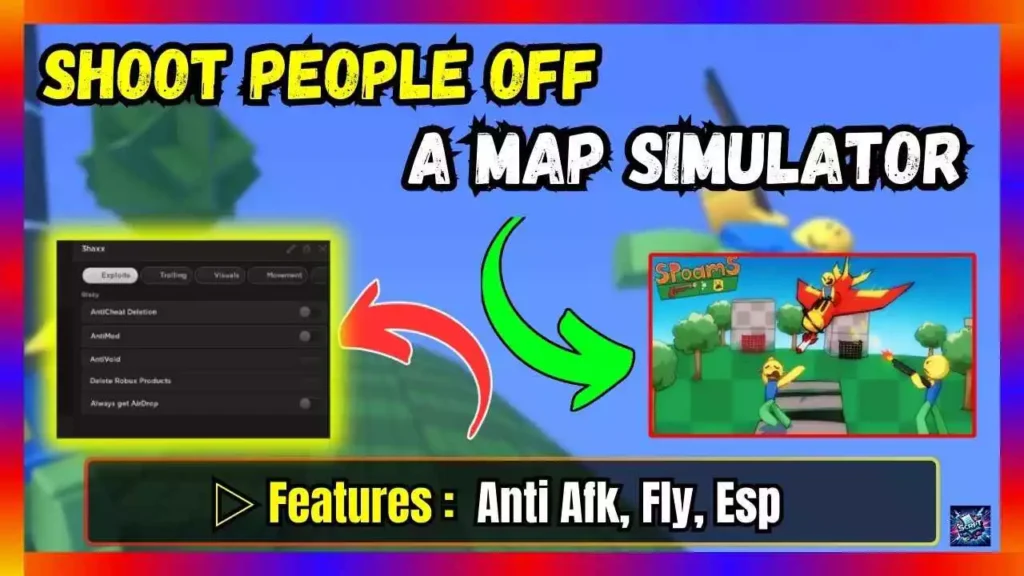 Enhance your gaming experience in Shoot People Off A Map Simulator with powerful features like Anti AFK, Fly, and ESP. These scripts keep you active, let you soar through the map, and give you a competitive edge by revealing player positions.